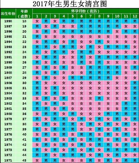 2017生男生女预测由两部分构成,横坐标为怀孕月份,从1月到12月,纵坐标为年龄和女性出生年份,女性出生年份是从1971-1998年,女性年龄从18岁到45岁,是以农历虚龄(即真实年龄加1 岁)算,而怀孕月份即是受孕的那个月份。(清宫图采用虚龄算法,因为中国人在古代时期是非常讲究孝道,尊重母亲的。母亲怀胎十月,就把在娘胎里的这十个月也算进自己的年龄,以此来感谢母亲这十个月为自己所承受的的痛苦。)